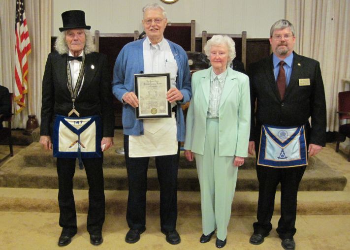 At our April stated meeting, Bro. Frank Cope was presented his Golden Veterans Award signifying more than fifty years of continuous membership in the fraternity. In the picture above are shown L to R, Worshipful Master Harry Pond, Bro. Frank Cope, Wanda Cope and Worshipful Gary Quintrell, Inspector of the 105th Masonic District.