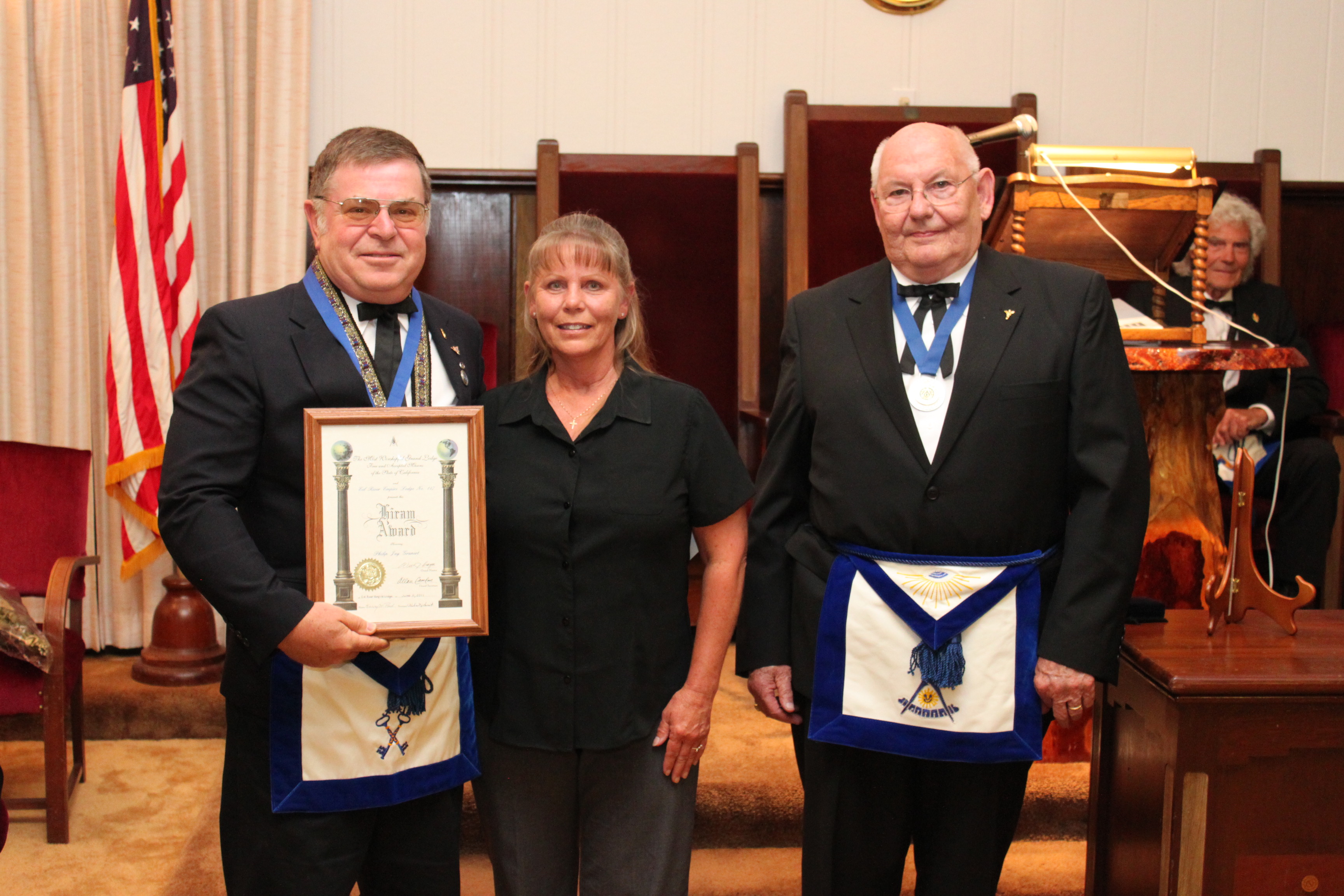 At our July stated meeting we had the pleasure of bestowing upon Bro. Philip Grunert PM, the Hiram Award. This was in recognition of his service not only to his Lodge but also to his community. Phil is a thirty six year member of Eel River Empire Lodge 147. Phil has been Treasurer of the Lodge since 2005 and has served on various committees and aids in degree work for the Lodge. He has also devoted many hours in an advisory capacity to the California Department of Fish and Game. He also participates in and is involved in many local fish and game activities.