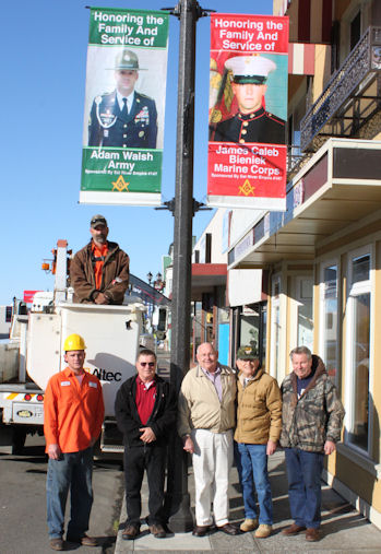 At the suggestion of our Junior Warden, Lee Hopkins, our community project for the year was to honor the service men and women of the Lodge’s sphere of influence. Lee was appointed as chairman of the project and our goal was to have made and placed on the city light standards, banners with pictures of the active service members. With the help of others of our brethren and members of the City, this project was brought to fruition on November 7th. As of this date, ten banners have been installed. It is intended that when a member retires from active service, the member’s banner will be removed and presented to the member and will be replaced by another active service member. We thank the City and their employees for their help in the project.