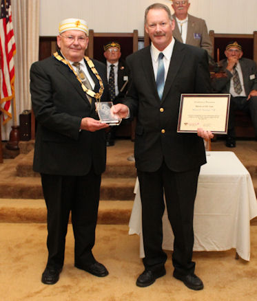 Many things happened this last month in our Lodge. On October 25th, Past Master Mike Flockhart was presented the Mason Of The Year award at the Scottish Rite Feast of Tishri dinner. The award was presented by Worshipful James G. Widdoes, Personal Representative of the Grand Inspector General, Scottish Rite Masons in Northren California. Pictured L – R: Jim Widdoes, Mike Flockhart.