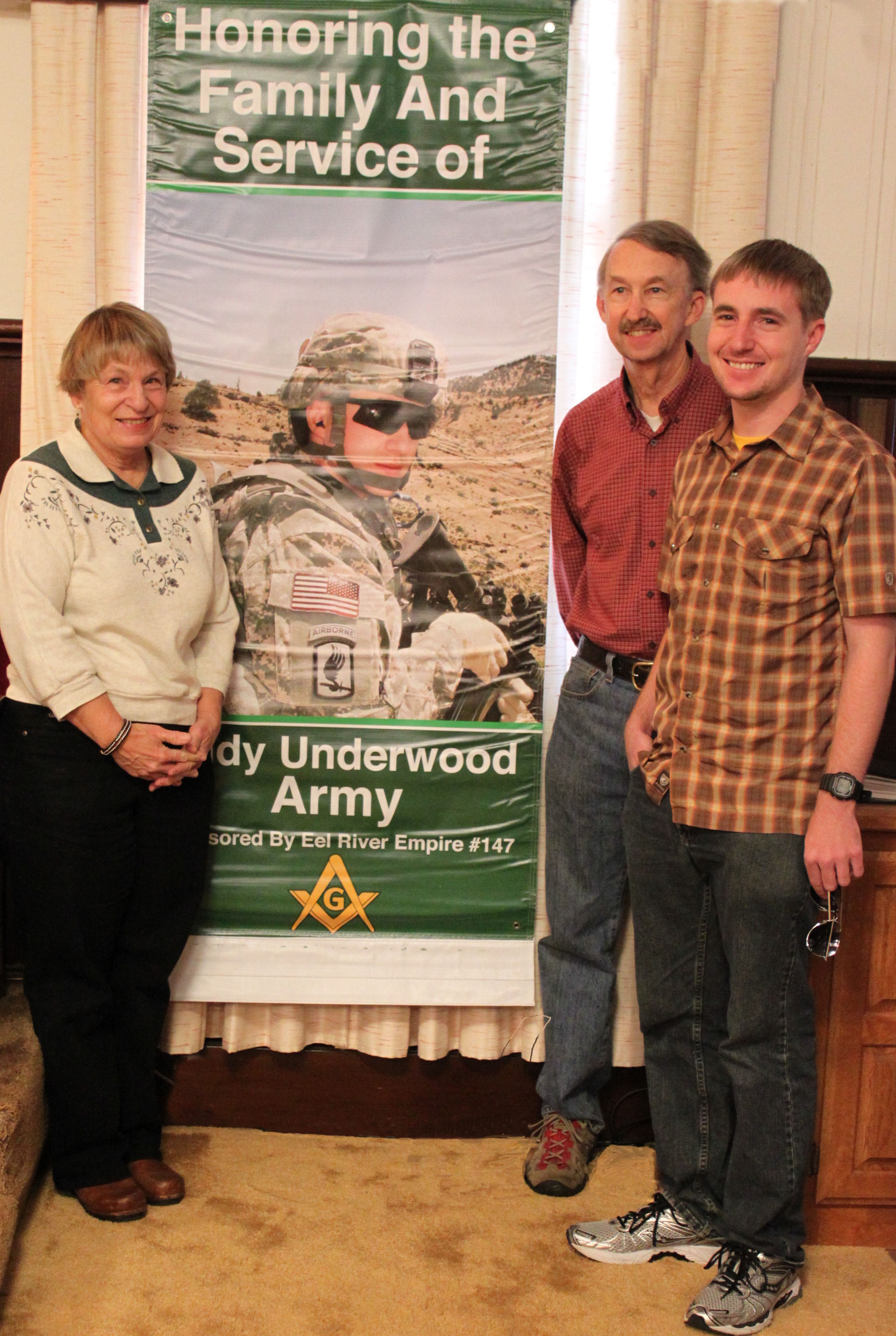 Andy is shown in the accompanying picture with his parents and the banner honoring him for his service to his country. The banner was displayed on Main Street, Fortuna, but was removed for the Christmas season, it is hoped that it will again be displayed  following the holidays.