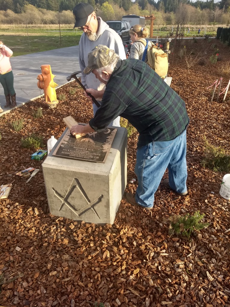 On November 6th, Eel River Empire Lodge assisted in opening the time caplule in the Corner Stone of the Fortuna Methodist Church’s 125th anniversary of the laying of the corner stone by Eel River Lodge, Rohnerville Ca. on June 12, 1889. In the capsule was the original dispensation to lay the corner stone. It was presided over by: Grand Master McMeil, Dep. Grand Master Melendy, Senior Grand Warden Eastman, Junior Grand Warden Edwards, Treasurer M. A. Webber and Secretary Joseph Hull. Think of the effort that the Grand Officers put forth to travel to Fortuna to officiate at this ceremony. The document is in amazingly good condition considering it’s age. There is some fading of the ink in the hand written document but the letterhead is in good condition and very legible.
